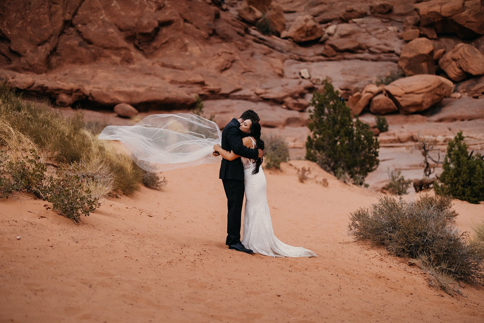 They shared first look in front of the tallest arch in the Windows section of Arches National Park. Dani walked to Troy and when he turned around you could see the instant admiration in his eyes. They checked out each other’s outfits and embraced in a hug. Today was the big day and you could feel it. Dani told Troy she had been waiting for this moment, for him to see her in a wedding dress, for years.