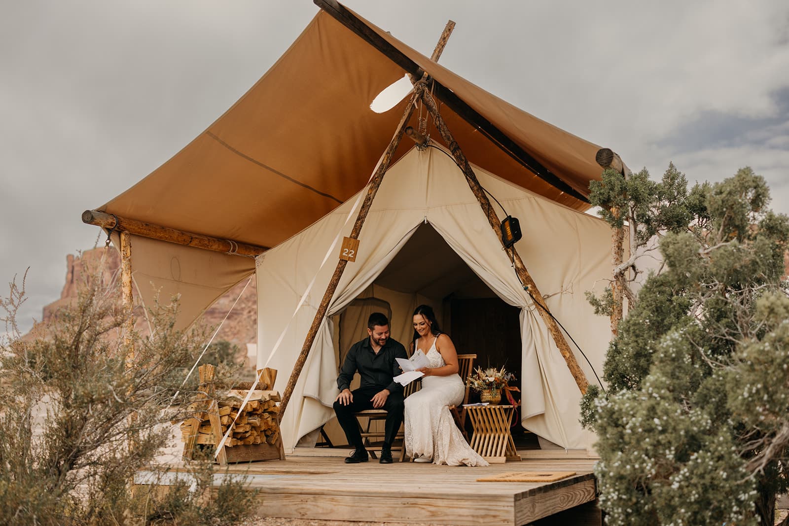 After the ceremony, we ventured around the edge of the vista checking out the different views it offered and capturing portraits. Dani had showed me on her phone a photo she had taken and loved of monument valley so we recreated that with them and the rock features at the state park. We took some silly photos too as we admired all the holes Dani’s veil had earned from exploring the desert. Then they loaded up back into their RV and we headed back to Under Canvas. Chef Emily had prepared a lovely dinner at the private fire pit area they had reserved. They sat at the romantic set up and started off with a toast and glass of “I do” champagne. Chef served a lovely appetizer and delicious dinner as they sat together chatting and enjoying together.