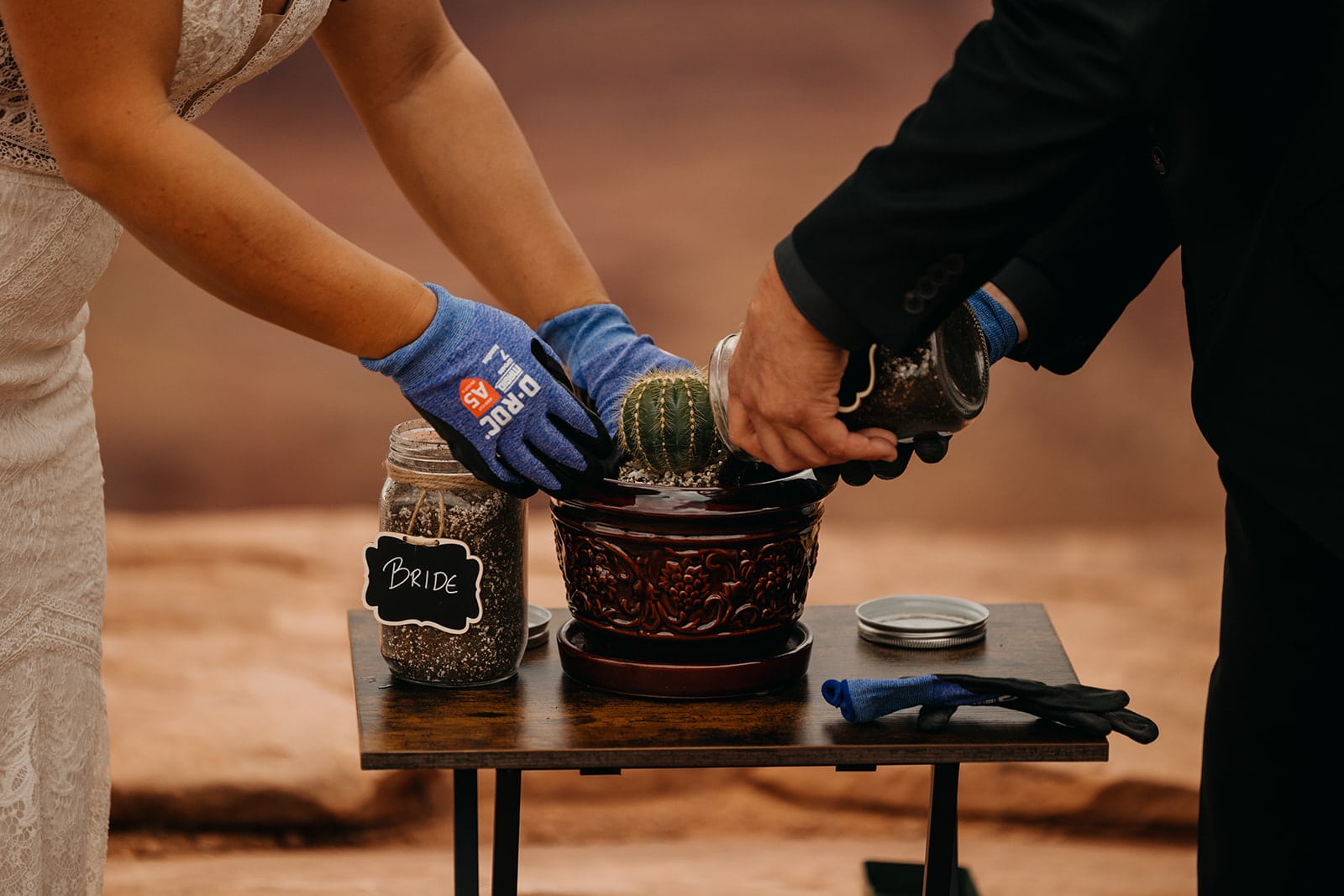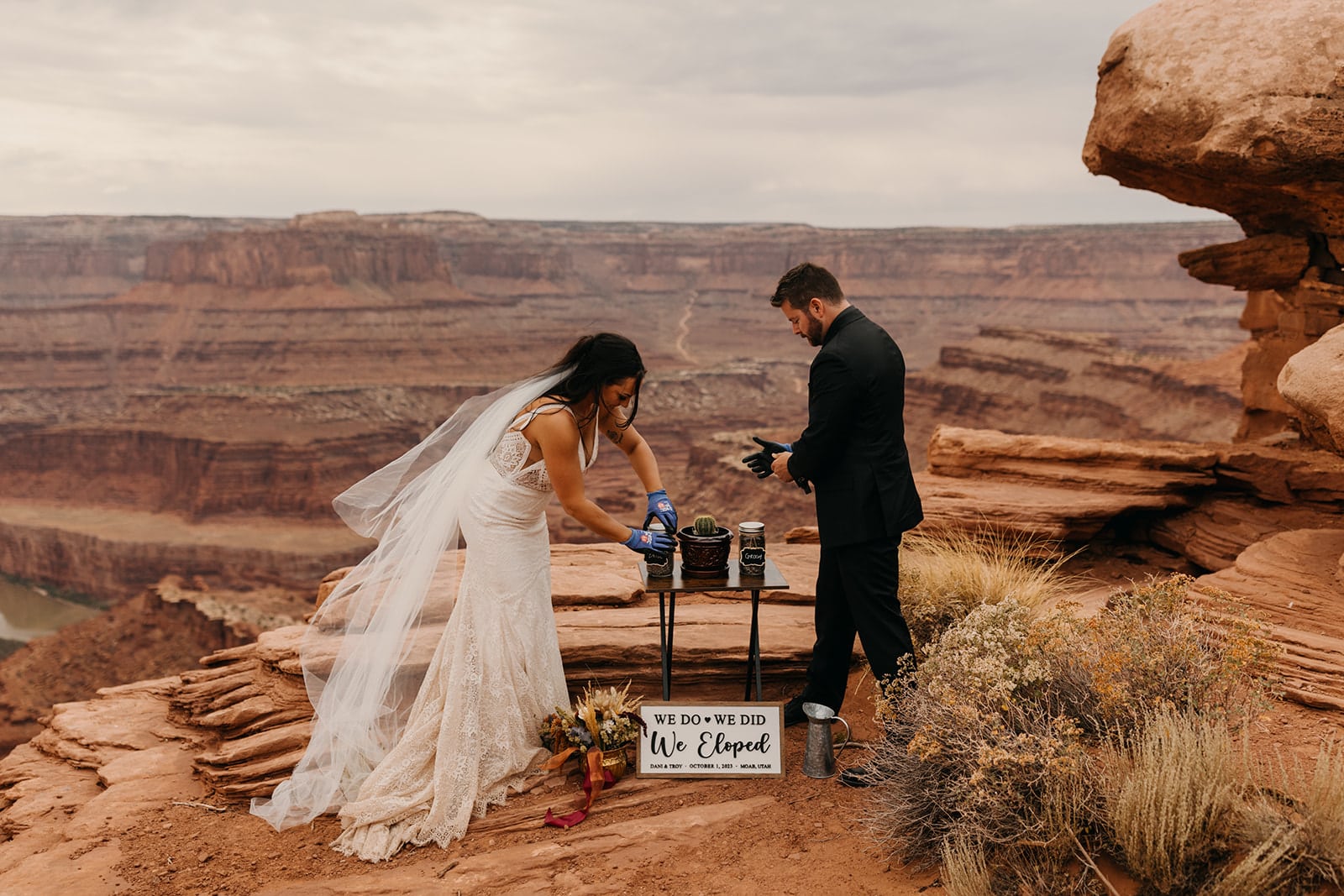 Upon arrival Danielle and Troy took some time to enjoy the view before setting everything up. The brought a table and cacti that they named ‘Utah’ for their unity ceremony. The also brought a “we eloped” sign and played some romantic music to during their ceremony. They started off by walking hand in hand together to Bill who officiated. The ceremony began with them planting their Cactus together into its new home with two different soils that Danielle and Troy had brought from back home and traveled with. Then they shared personal vows which brought happy tears and even a few rain droplets fell from the sunny sky.