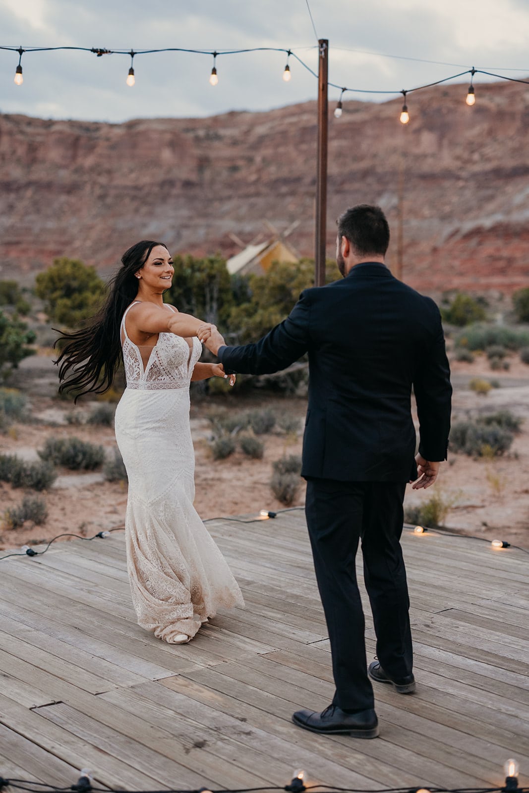 As the night settled they shared one last dance together, privately, just them two and their empty venue. They held each other close as if holding onto remembering this night, this moment forever. Then it was off to the bus to join everyone in returning to Moab. Their guests made an aisle for them with sparklers and cheered them as one last hoo-rah! They did it, they tied the knot in the most beautiful celebration you could imagine.