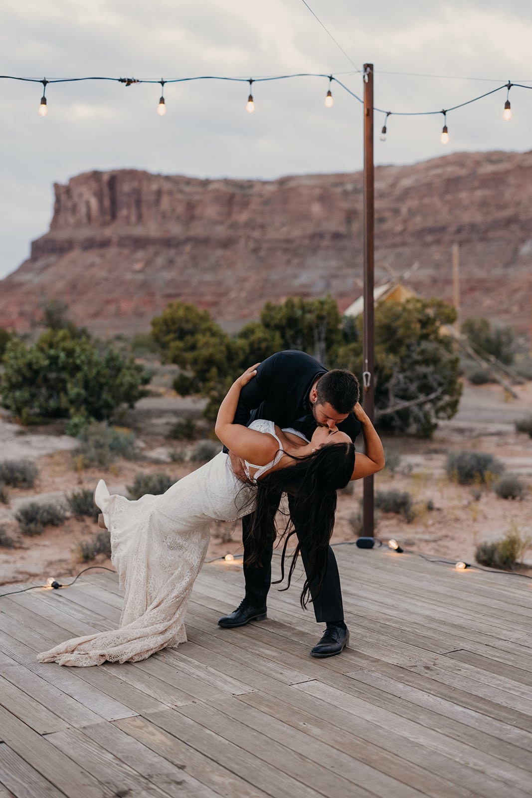 Once dinner was finished they stoked the fire and headed over to the main stage to have their first dance together surrounded by twinkle lights under a colorful sunset sky. They showed off their moves in a beautiful dance in complete privacy. It was a romantic way to soak in the last moments of daylight on their wedding day. The night was still young though. We gathered around the fire making smore’s checking out the starry sky and just chatting about the day, the trip and what was ahead as they would continue their desert road trip for their honeymoon.