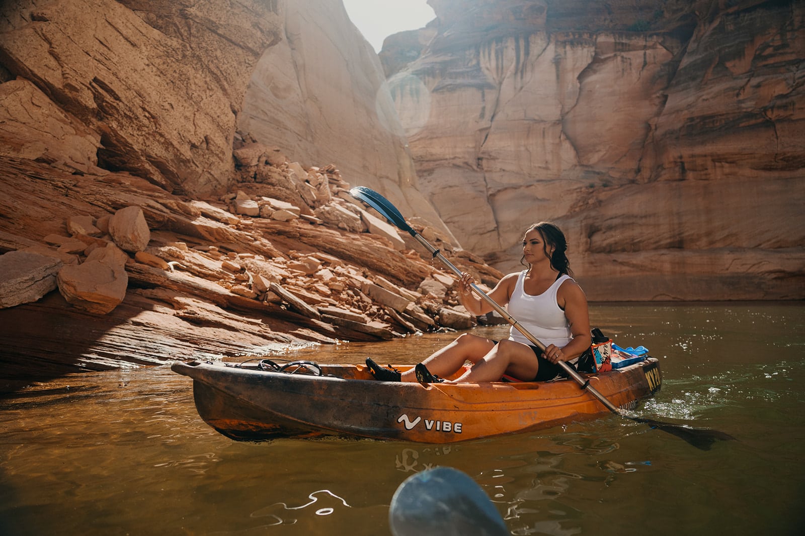 Danielle stopped to feel the sand and the rock walls. It was so fun getting to play and just soak in the experience. We made our way back through the canyon to where we had pulled our kayaks to land. As we headed back, we ventured through much rougher water as the lake had started getting lots of boat traffic making for a whole new adventure!