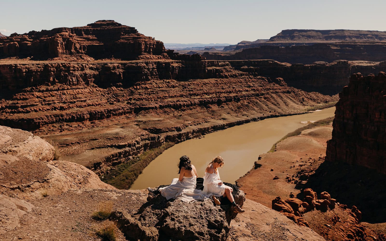 We reached our highly anticipated destination, Dead Horse Point State Park. Reanna and Roxy decided to share their vows with each other here, privately. It was a moment of peace all around and joy as they shared their love with each other – their coming to this point, promises for the future and happiness for where they were now. Following their vows we ventured around the massive edges of the canyon cliffs that tower over the road they had driven to get here. They shared champagne out of cups with their Bernadoodle’s faces on them and confetti cake. They read a letter from a dear friend of their’s that was not able to attend the wedding that was originally going to officiate their ceremony. They took some time, as the sun set behind the canyons, to cuddle up and Reanna read the letter allowed to Roxy. You could tell the letter was filled with so much love, wisdom and care, it was truly a perfect way to end day one of their elopement wedding.