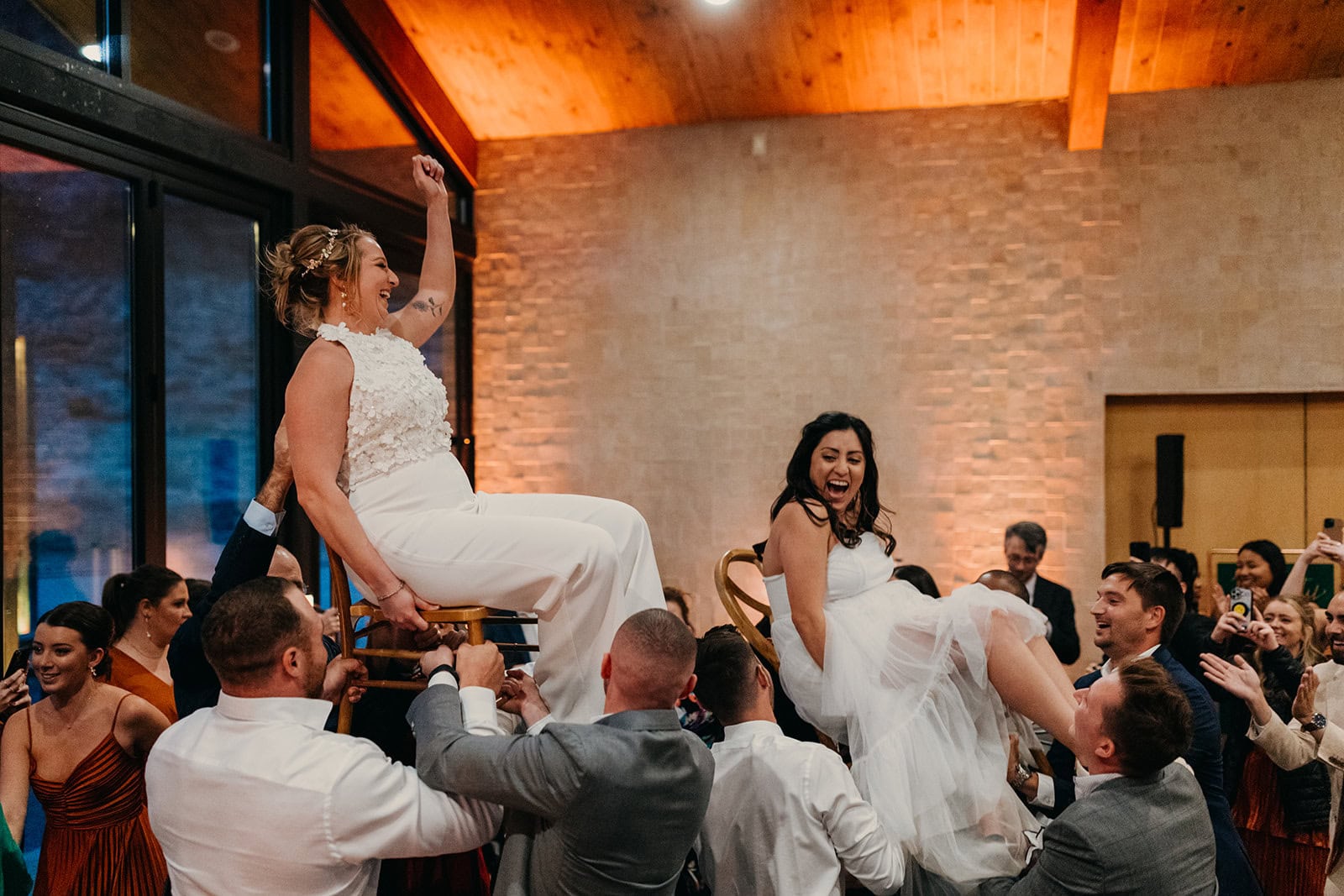 Cocktail hour consisted of specialty cocktails designed by each bride, their guests taking in the incredible views and hugs for the brides. The brides entered their reception in the beautiful glass building where all their guests awaited in their reception dresses. Each bride danced with their father’s as their mother’s looked on emotionally. Soon after Reanna and Roxy shared their own first dance, of which they had been going to dance lessons for as a fun activity to do together pre-wedding. Following their first dance, they shared with guests a couple of traditional dances, the Hora Dance and the Italian Tarantella.