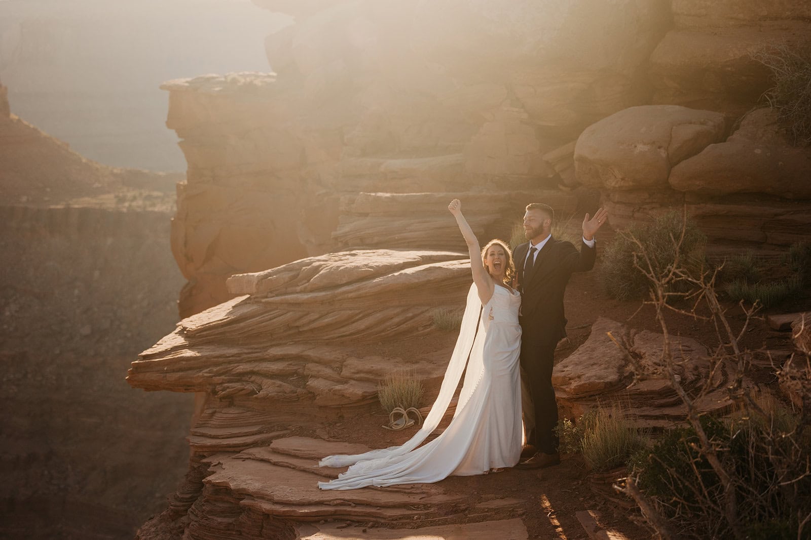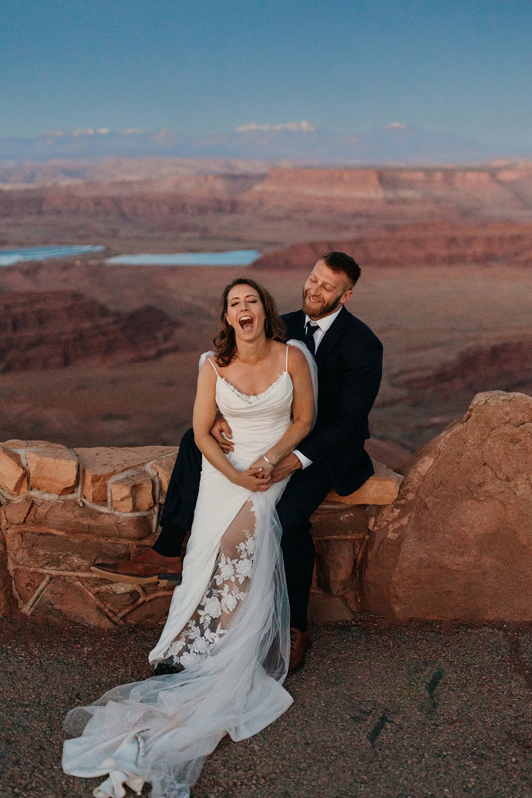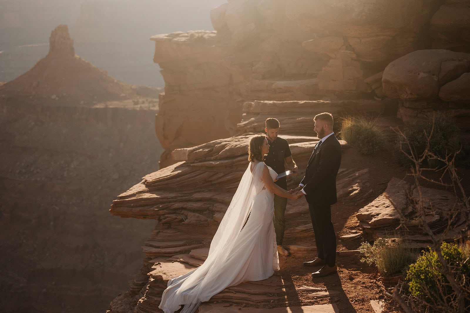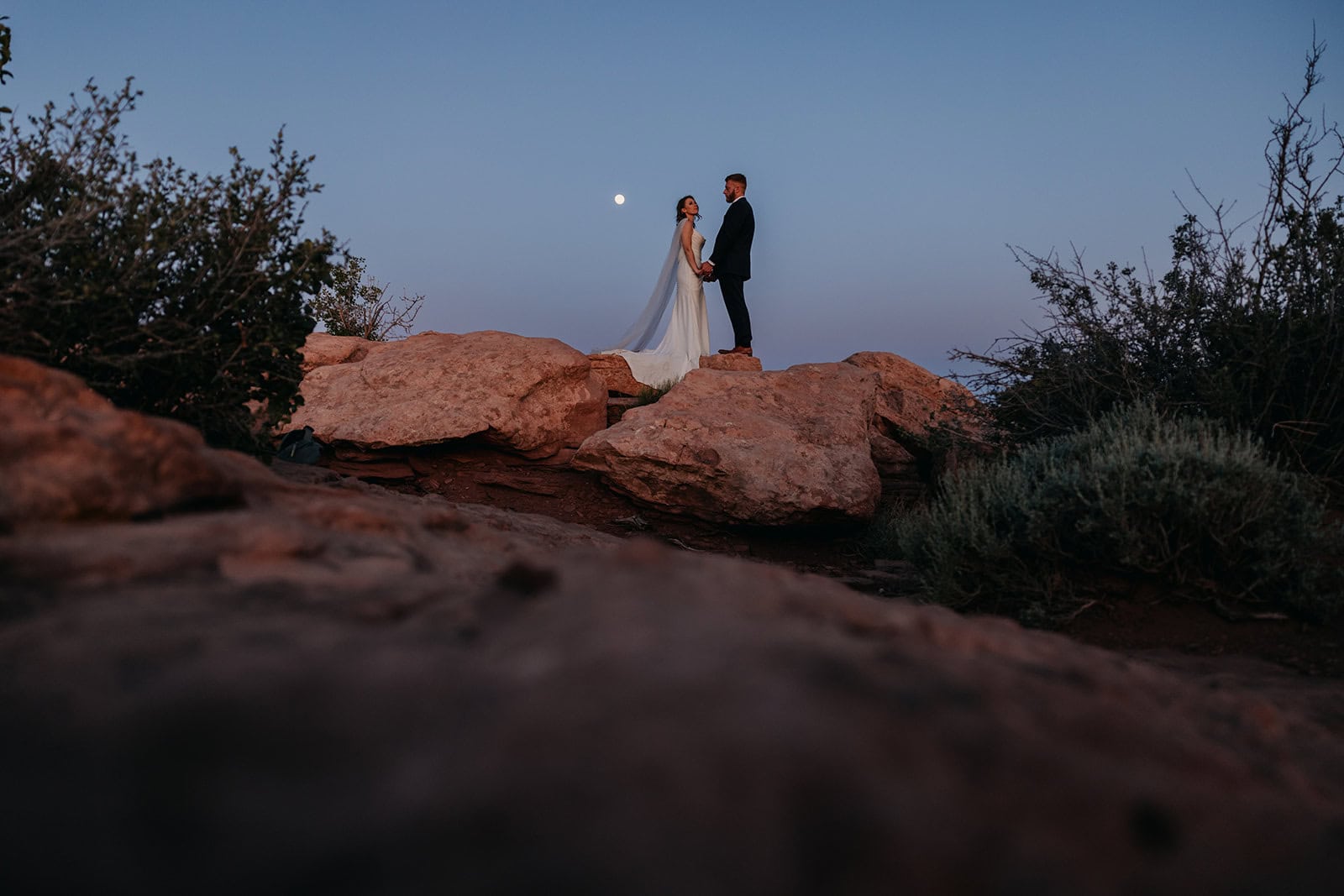 Following the ceremony they enjoyed the rest of the evening exploring the edges of the vista overlooking the Colorado river, Canyonlands National Park and watching the sky turn dark blue and the almost full moon rise above them.