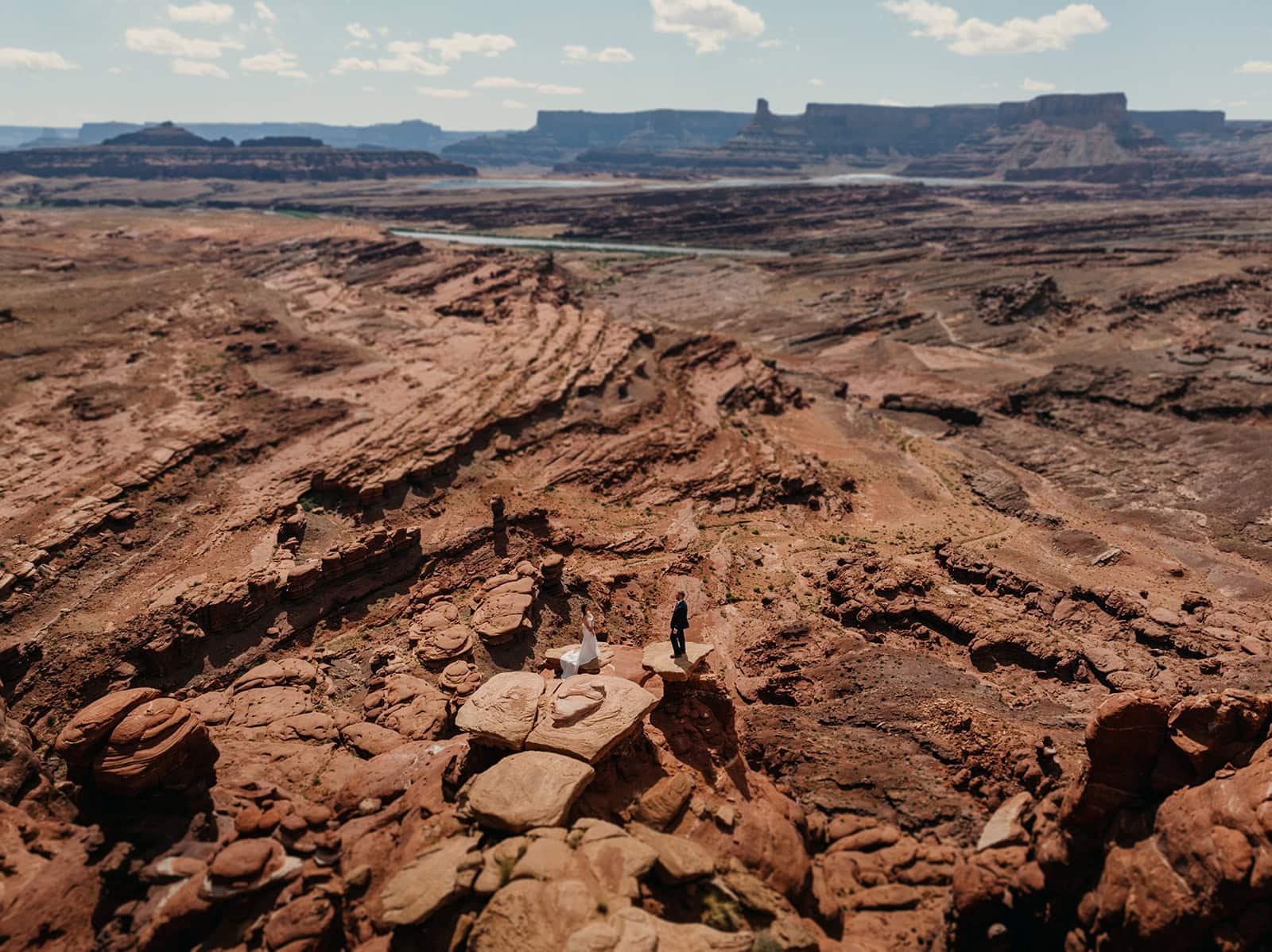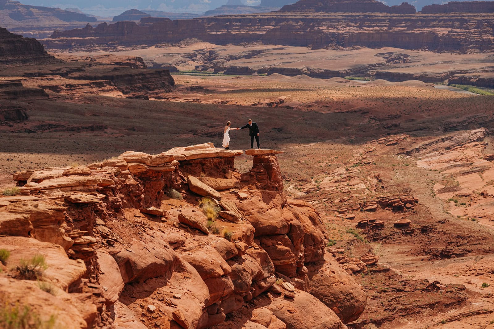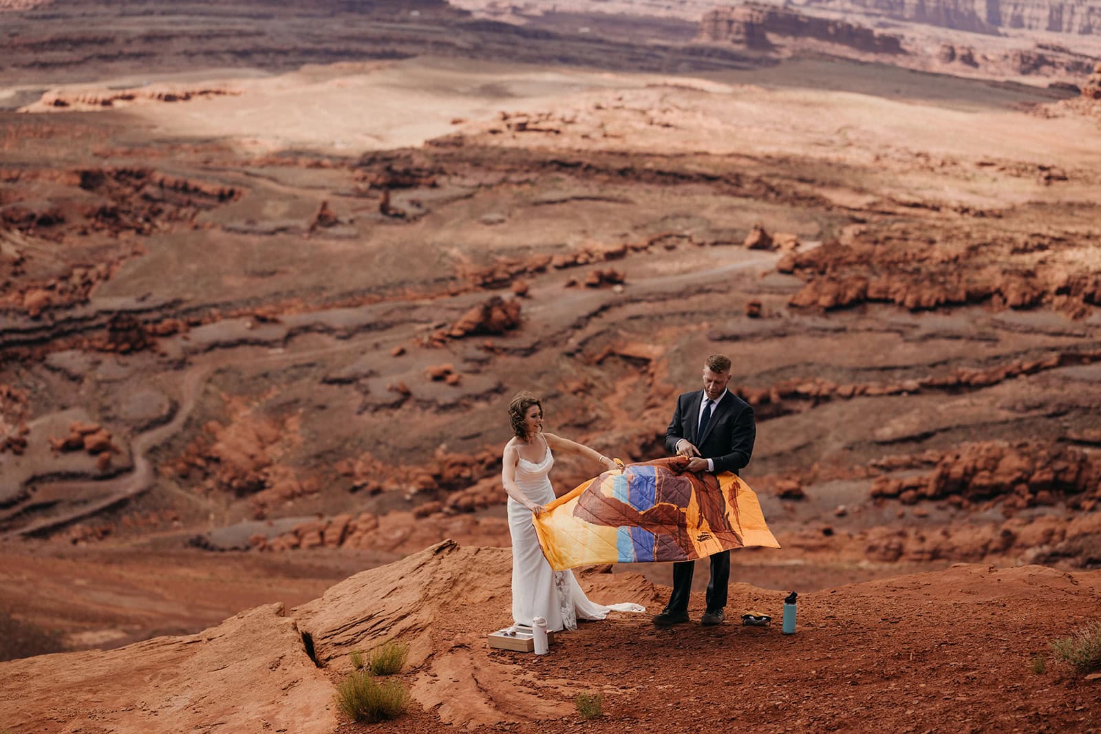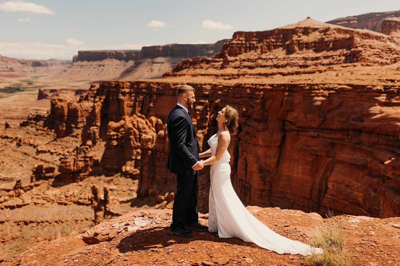 Following the ceremony they enjoyed the rest of the evening exploring the edges of the vista overlooking the Colorado river, Canyonlands National Park and watching the sky turn dark blue and the almost full moon rise above them.