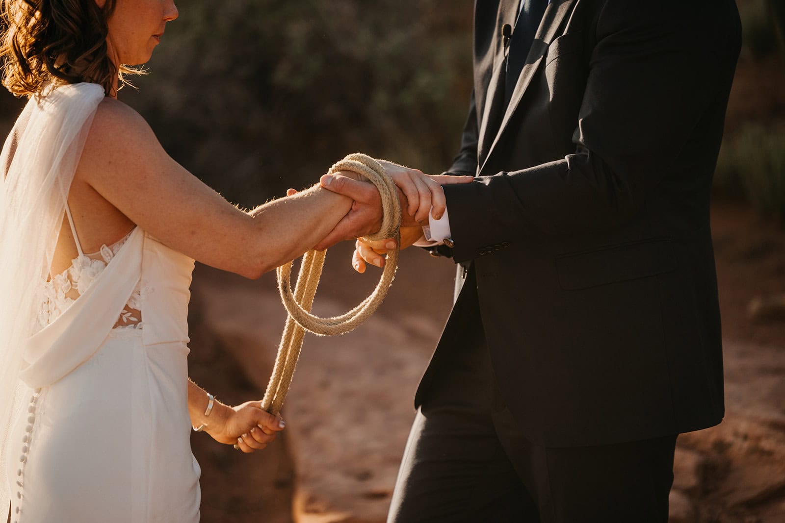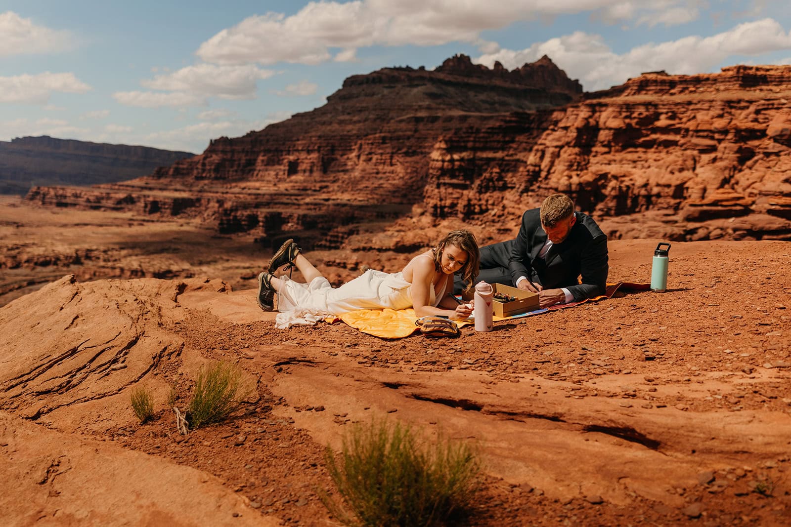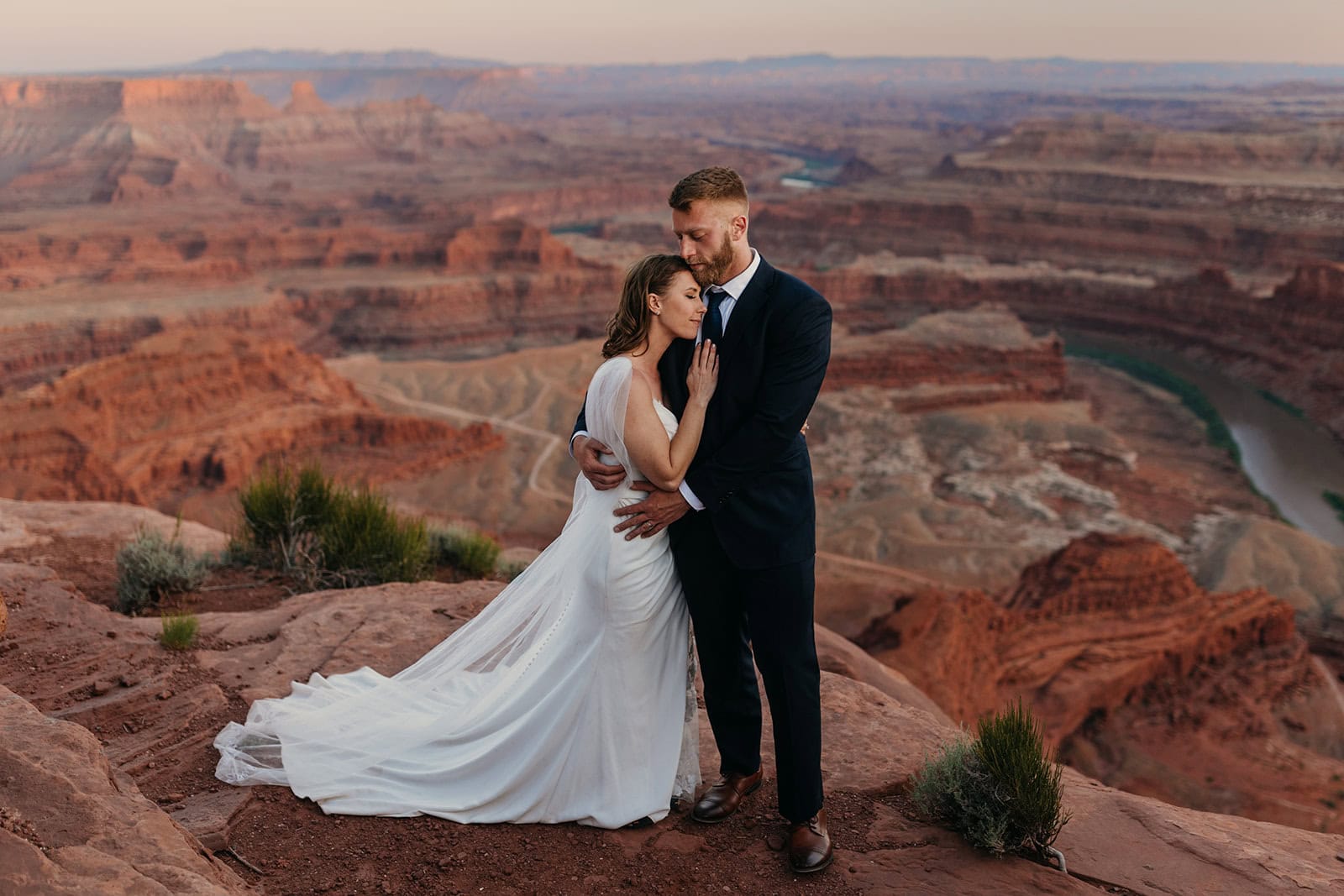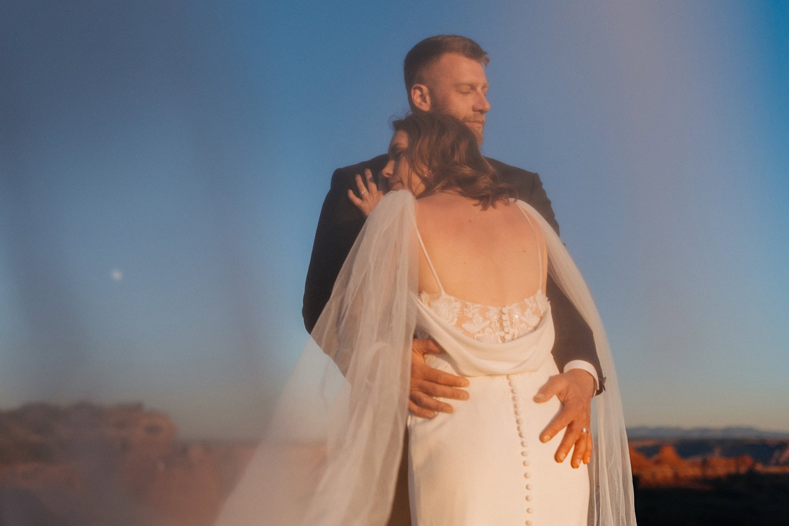 Following the ceremony they enjoyed the rest of the evening exploring the edges of the vista overlooking the Colorado river, Canyonlands National Park and watching the sky turn dark blue and the almost full moon rise above them.