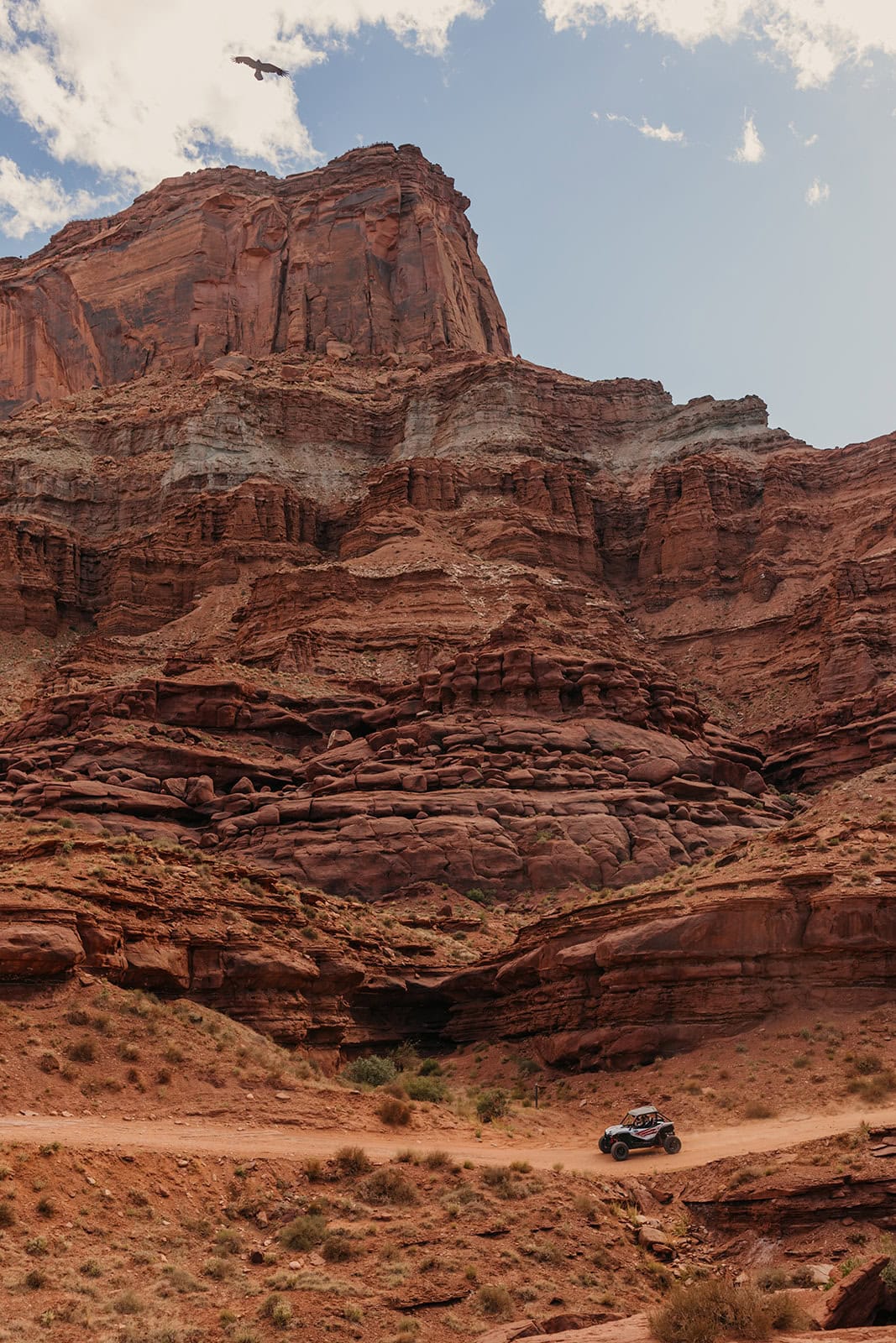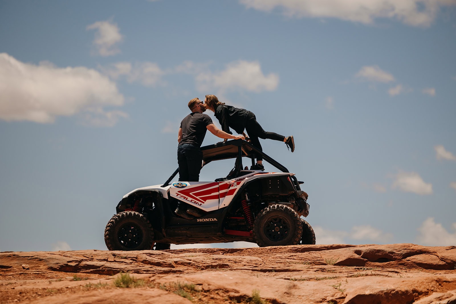 Before adventuring our way back out of the canyons we hiked around exploring the toad stools, vista views and playing in the UTV. Rachael + Chris orginally wanted to off road on dirt bikes to start their elopement day as a way to honor their first date/day they met each other. Their first meeting ended in them riding Chris’ dirt bike down the night roads. So when we saw some fellow off roaders on dirt bikes, I had to ask them if they would be up for a photo for these two on their wedding day + they were! Adventuring mixed in with a few sentimental moments was the perfect way to set the tone of their day!