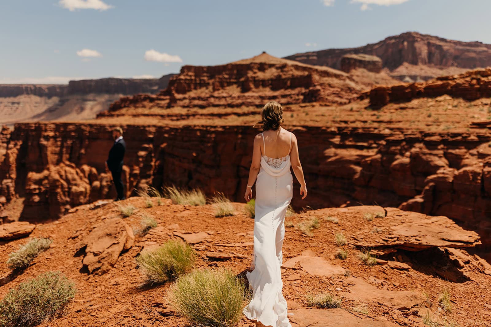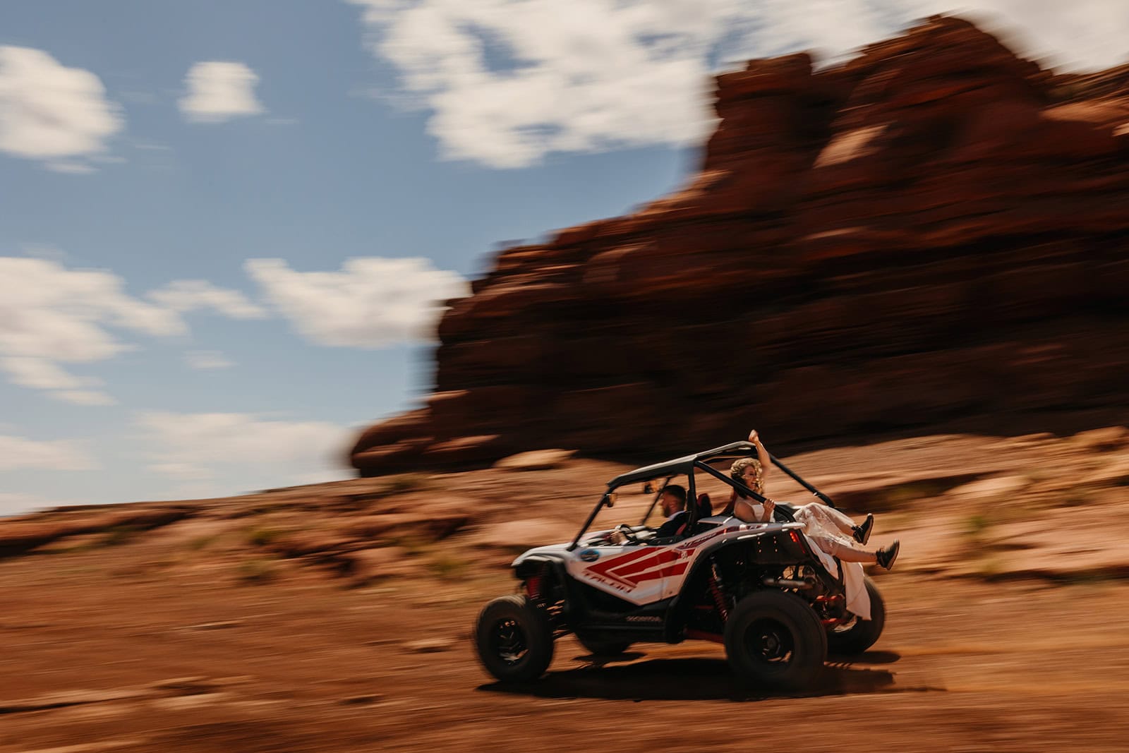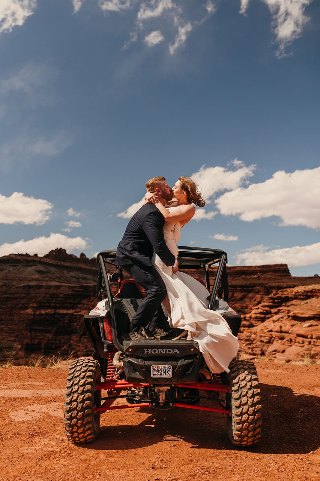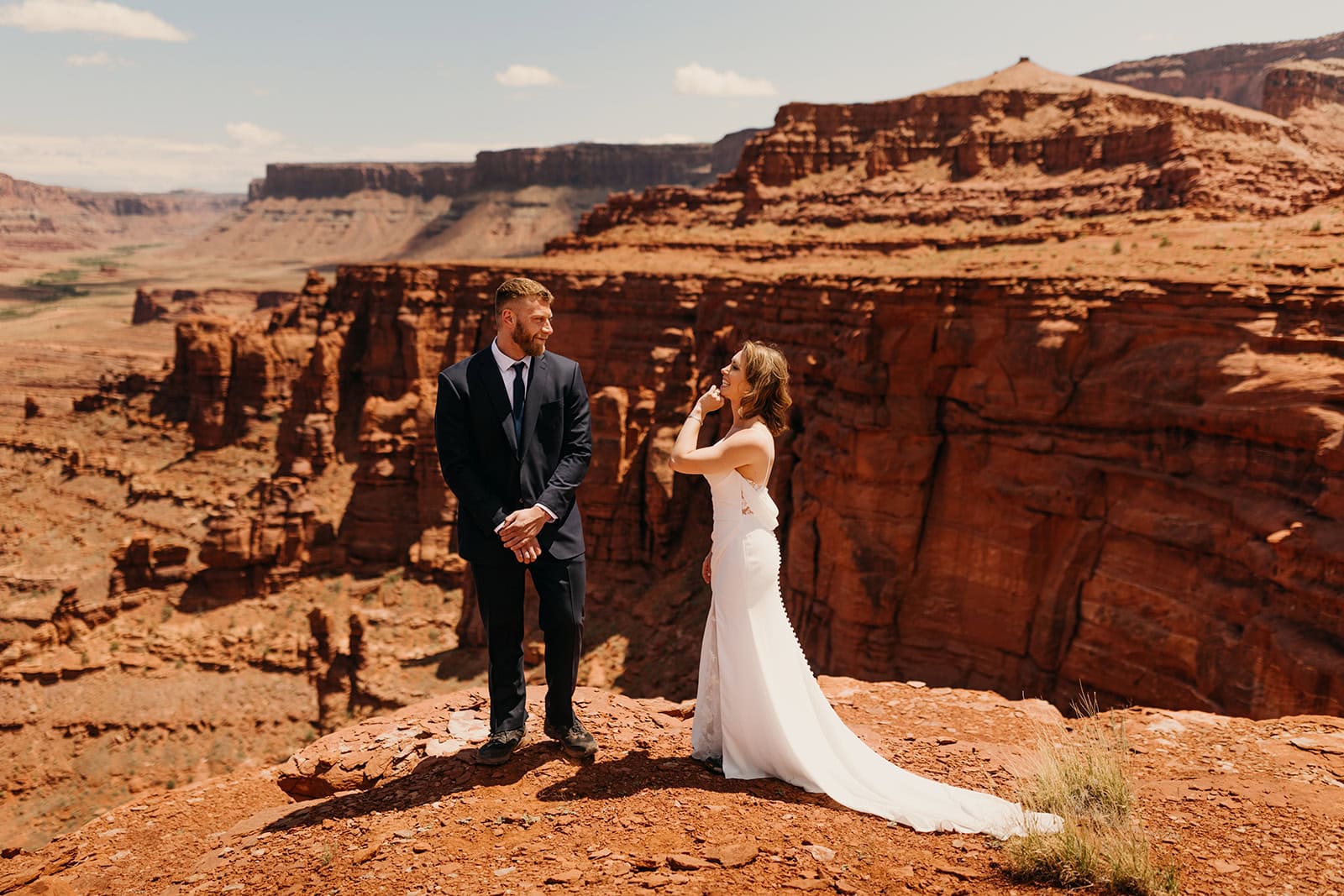 On the elopement day we met at their hotel to head out to drive into the depth of the canyons together. They adventured together in a UTV way down a twisting dirt road that lead all the way back up and out to a stunning vista view. After a few playful moments in their UTV, we hiked a little social trail off of the road for them to change into their wedding attire and share a first look together. Just them + the canyons to take in the day had arrived and they would be getting married!!