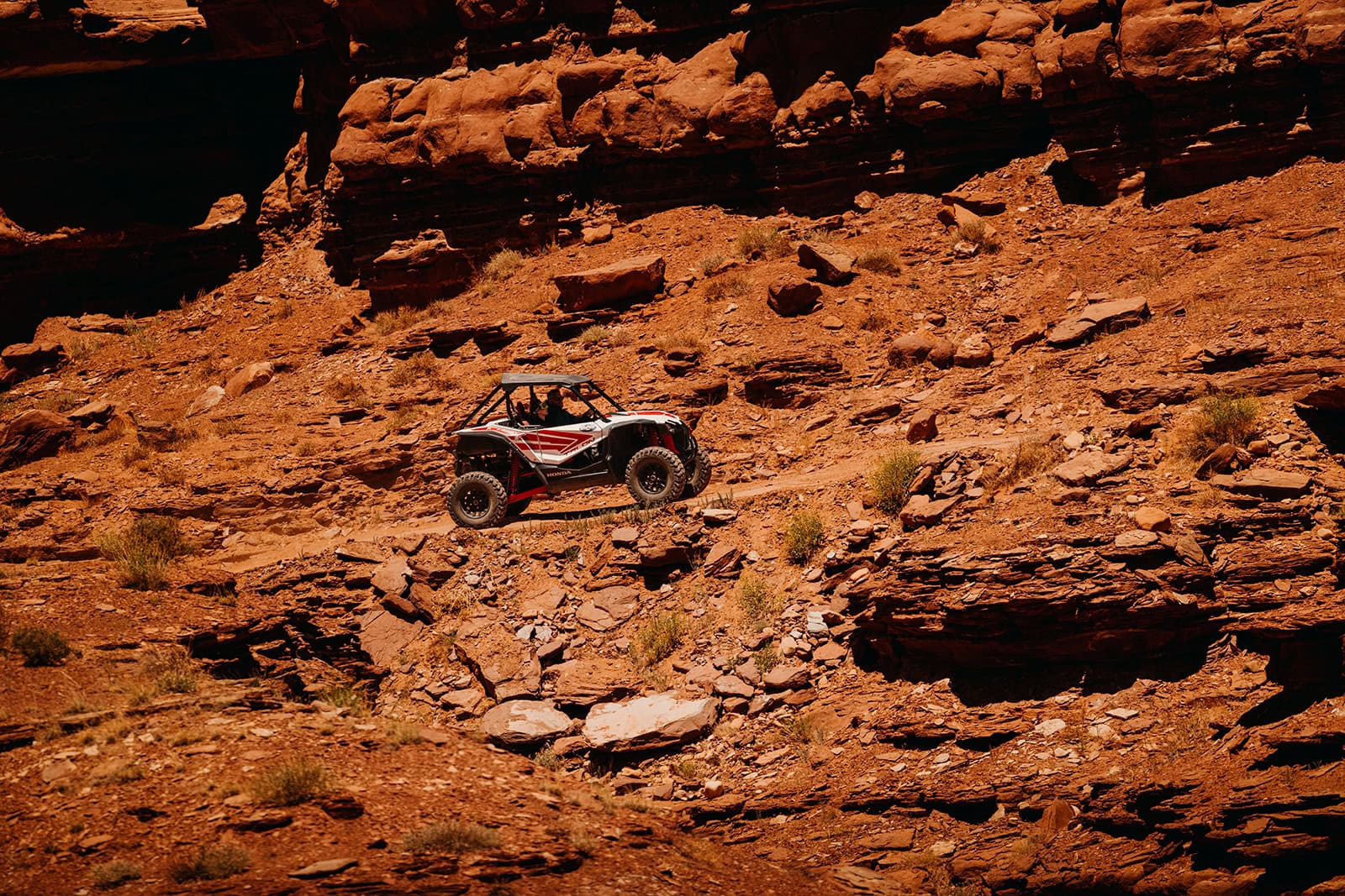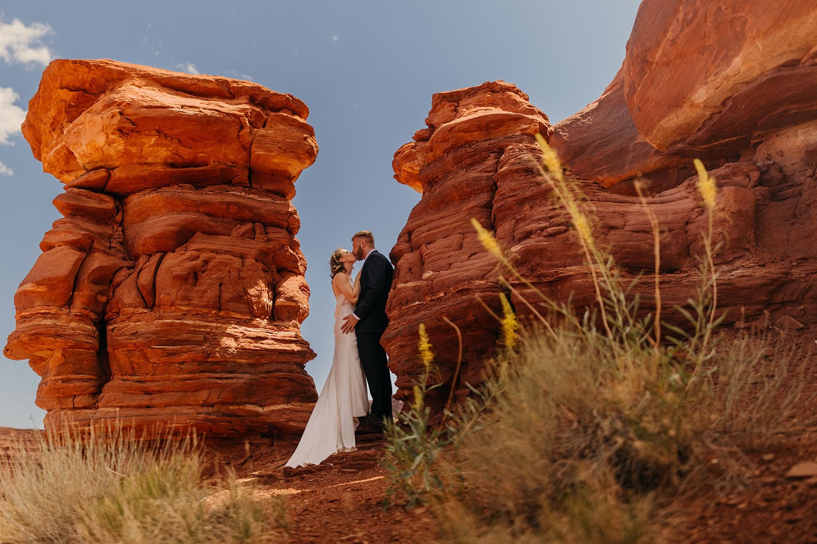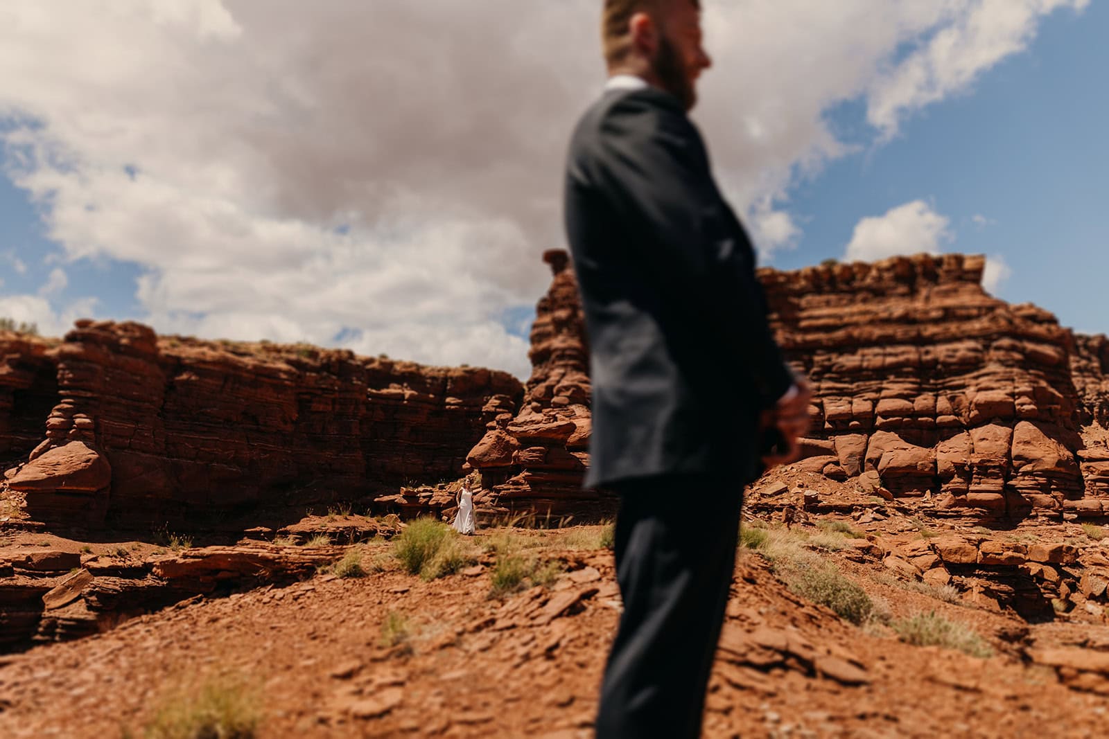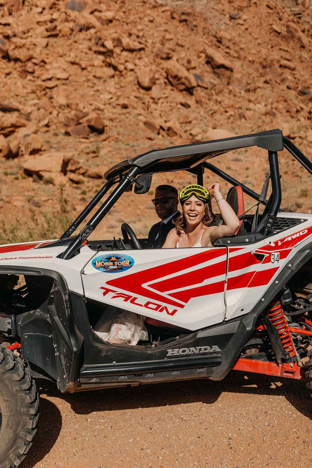 On the elopement day we met at their hotel to head out to drive into the depth of the canyons together. They adventured together in a UTV way down a twisting dirt road that lead all the way back up and out to a stunning vista view. After a few playful moments in their UTV, we hiked a little social trail off of the road for them to change into their wedding attire and share a first look together. Just them + the canyons to take in the day had arrived and they would be getting married!!