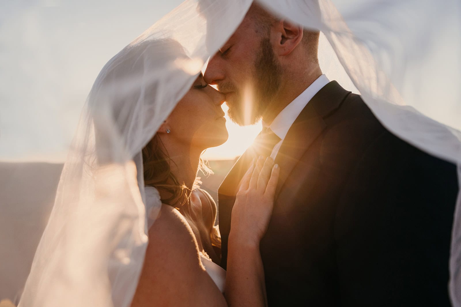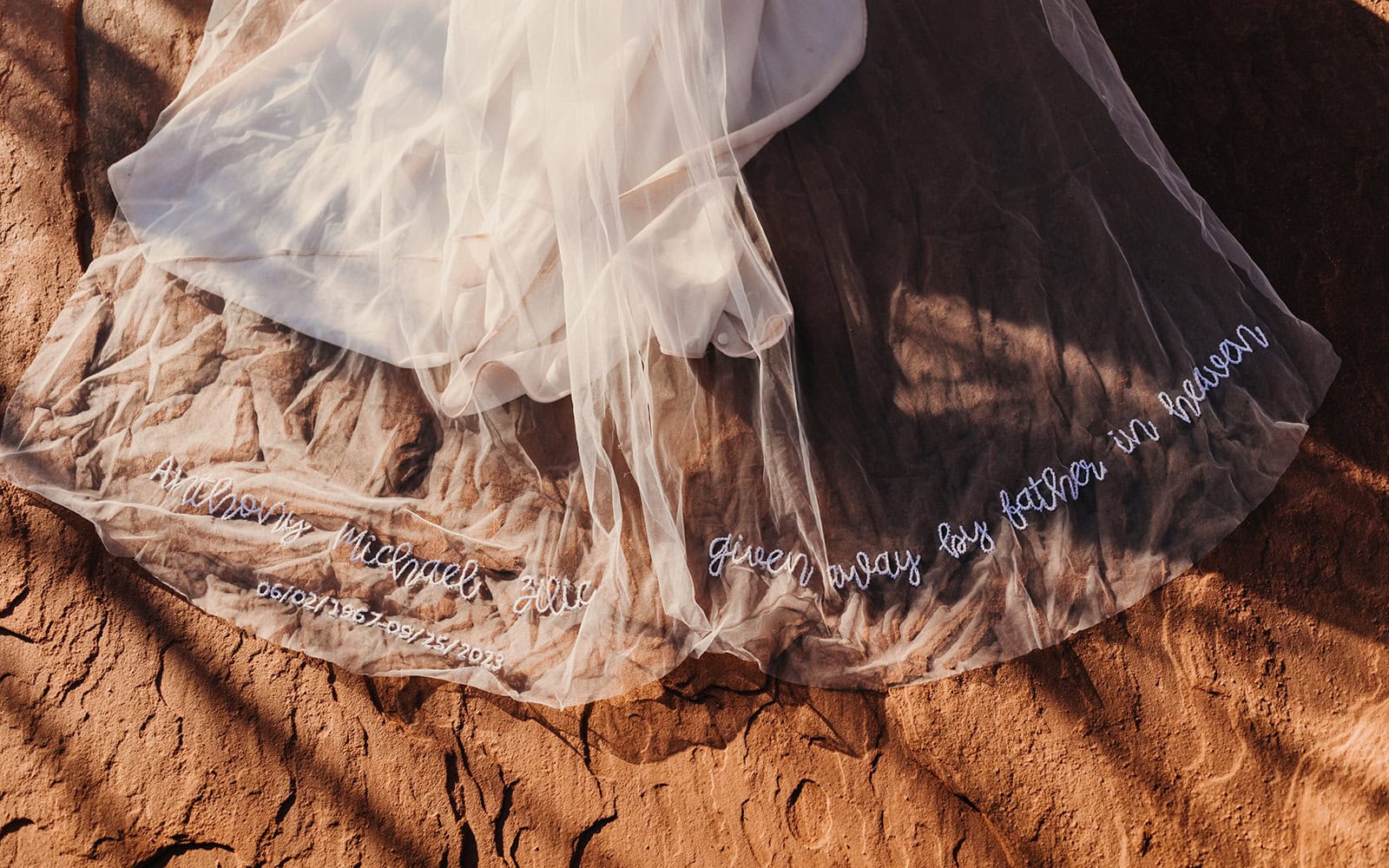 Both Chris + Rachael had lost their fathers during their time dating and they both meant a lot to them. To include their dads in their ceremony Rachael had her veil embioreded with her father’s name and a sweet note for down the aisle. During their ceremony they shared a hand fasting ceremony using rope that Chris’ dad kept in his truck his entire life. Their ceremony was private and felt as if time stood still for a moment surrounded by the evening beauty of the desert vista. They shared their personal vows and a passionate kiss to seal the deal.
