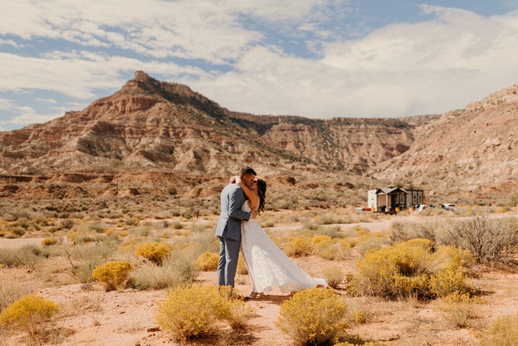 After the morning adventure, they set out to head back to their tiny home rental on the outskirts of Zion to start getting ready for rest of the day. They had found the perfect stay – it had great starry night views, the most charming porch deck, and even a hot tub for spending some close quality time together! With their busy schedules + raising kids, they were very excited to celebrate together and get this special time together! After they were both dressed and ready to set out, we sent Marty out to a field surrounded by wild flowers to wait on Pela for their first look. You could feel the excitement as Pela made her way over to show off her dress! They shared a beautiful moment together and of course the holy crap this is happening + lets freaking do it!!!!! We set out for their ceremony location – a private nook off a dirt road at the mouth of a canyon. Their ceremony was just them two! They shared private vows with each other + ended their ceremony with a hand fasting ceremony. Of course, sealing the deal with a big kiss!!!