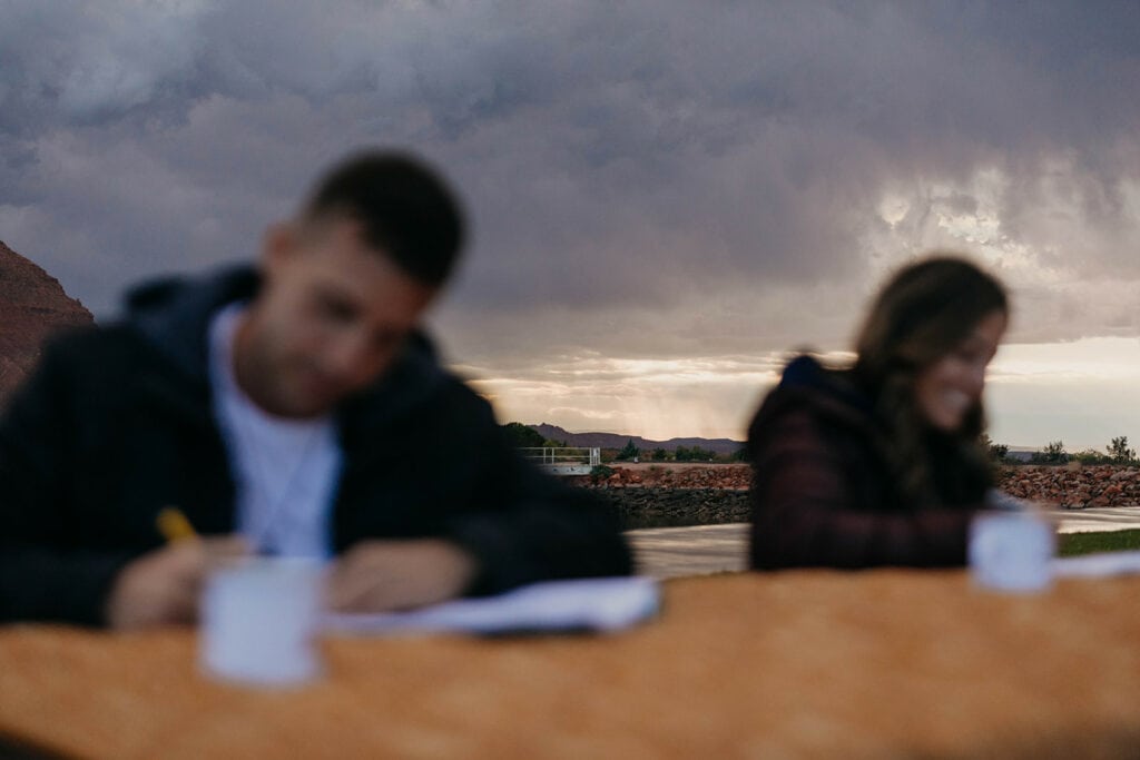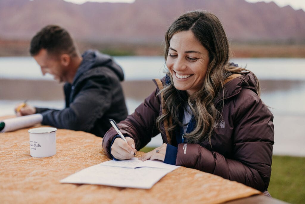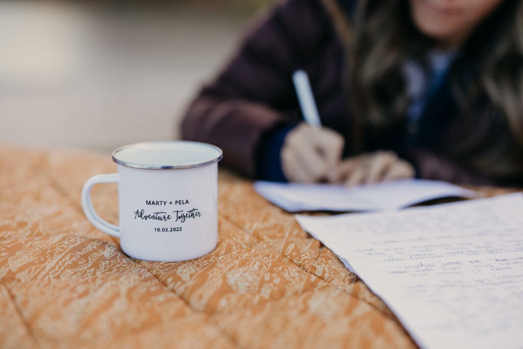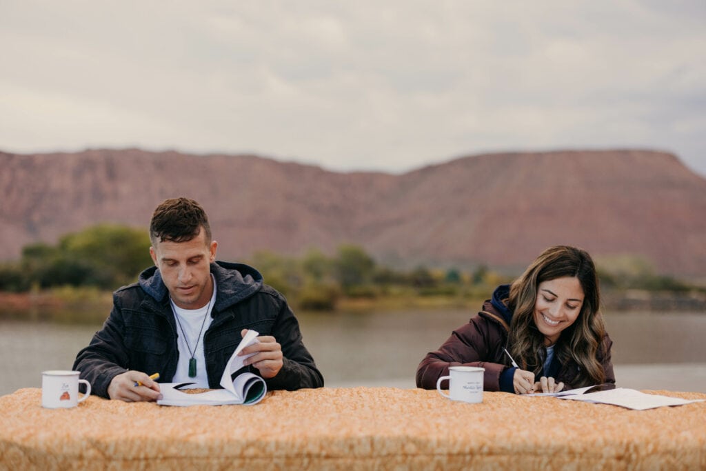 On the morning of their elopement we started out at a local coffee shop to pick up coffee (a morning must!) and breakfast to go! As we headed out the pouring desert rain came in. While rain may not be ideal for a wedding day, it felt soothing, calming and slow. Just right for the mornings activities. We had our breakfasts in our cars while we waited for the rain to pass. And when it did shortly after, it left us with a desert smelling of fresh rain and if you have ever experienced it you know how magical it can be. Once the skies started to clear we headed to a picnic table near the lake so Pela + Marty could write their vows. It’s always such a great way to start off a wedding day, taking the time to sit together and to focus on why you are marrying your partner and setting the tone for the day.