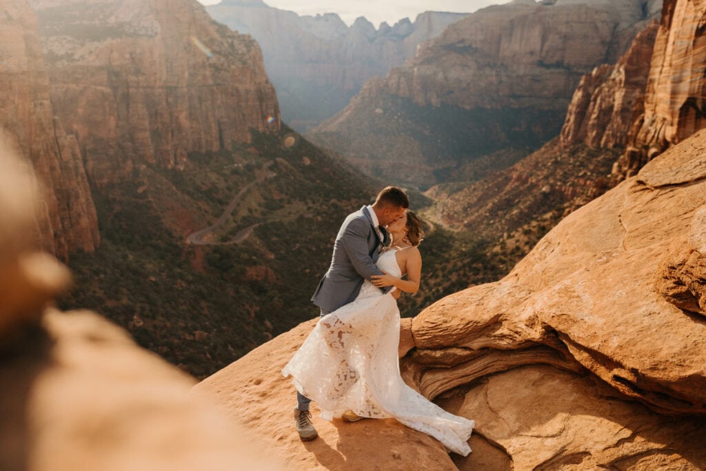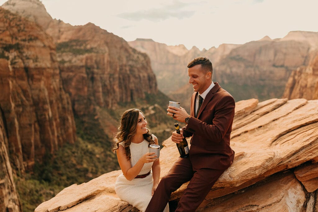 Now that they were officially wed it was time for more adventure! We hopped into the car and headed into Zion National Park. We started up the trail on a new hike for both of them. As we made our way they stopped to take in the views and say thanks to the folks congratulating them on trail. Once we made it to the top they took in the view, played on the cliff edges and really took the time to be present together. Before the sun set behind the canyon Pela changed into her second dress – a vintage 1960’s dress she had found -a true gem. Marty also changed into a suit more complimentary to go with her dress change. I loved their change in outfits. It was like two completely different vibes – At first they were dressed for a day time big event and then switched to a super classy and dressy evening of fun. We explored more areas of the high up cliffs as the sun began to dip. Once the sun was gone it was time to hike back to the trailhead. These two had a private catered dinner and personal chef waiting back at their stay for them!