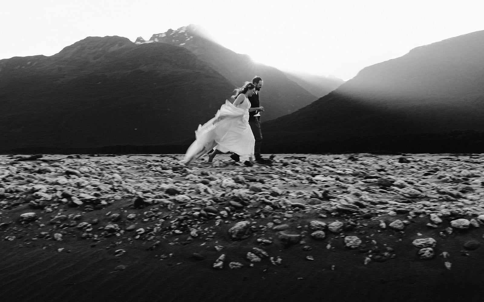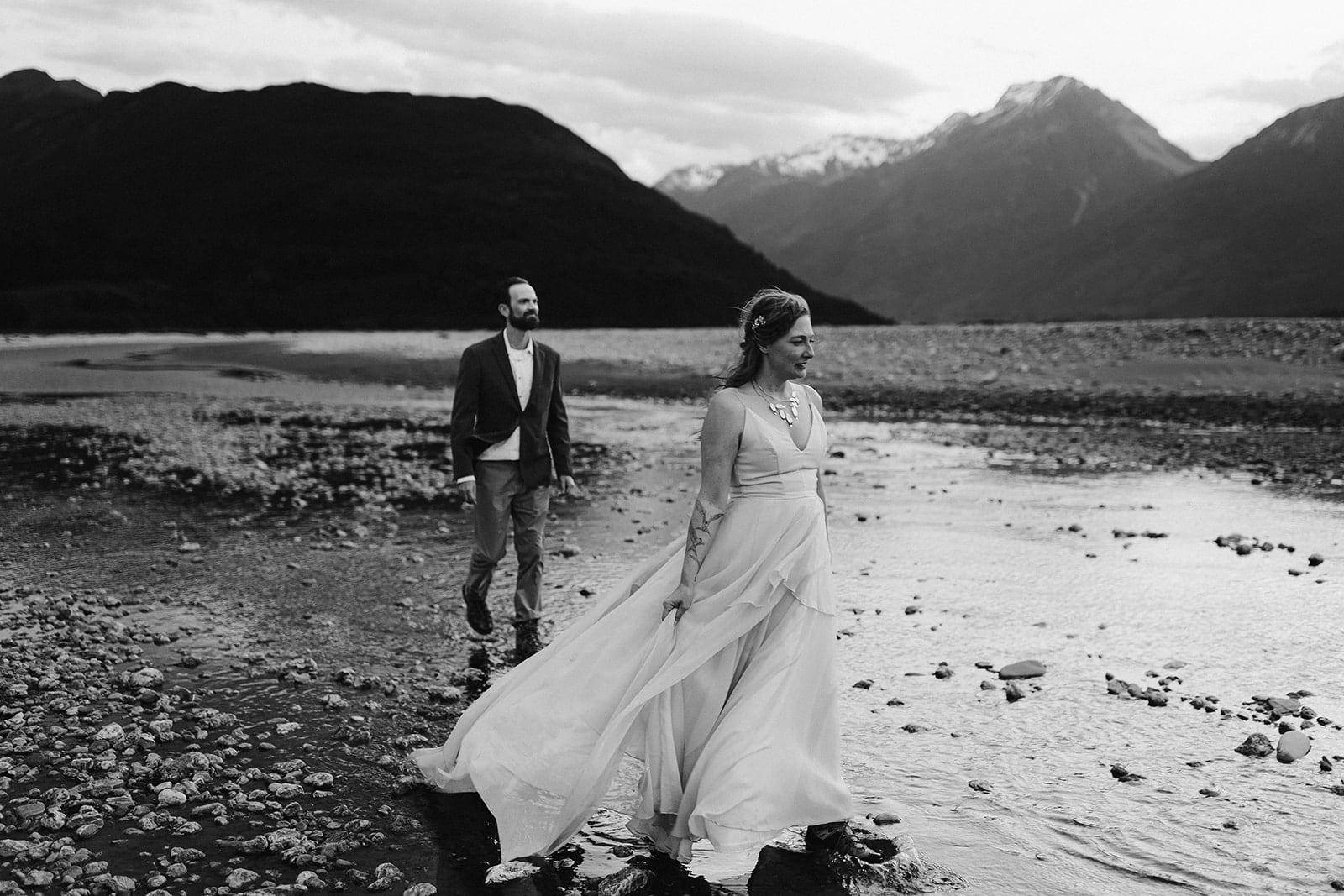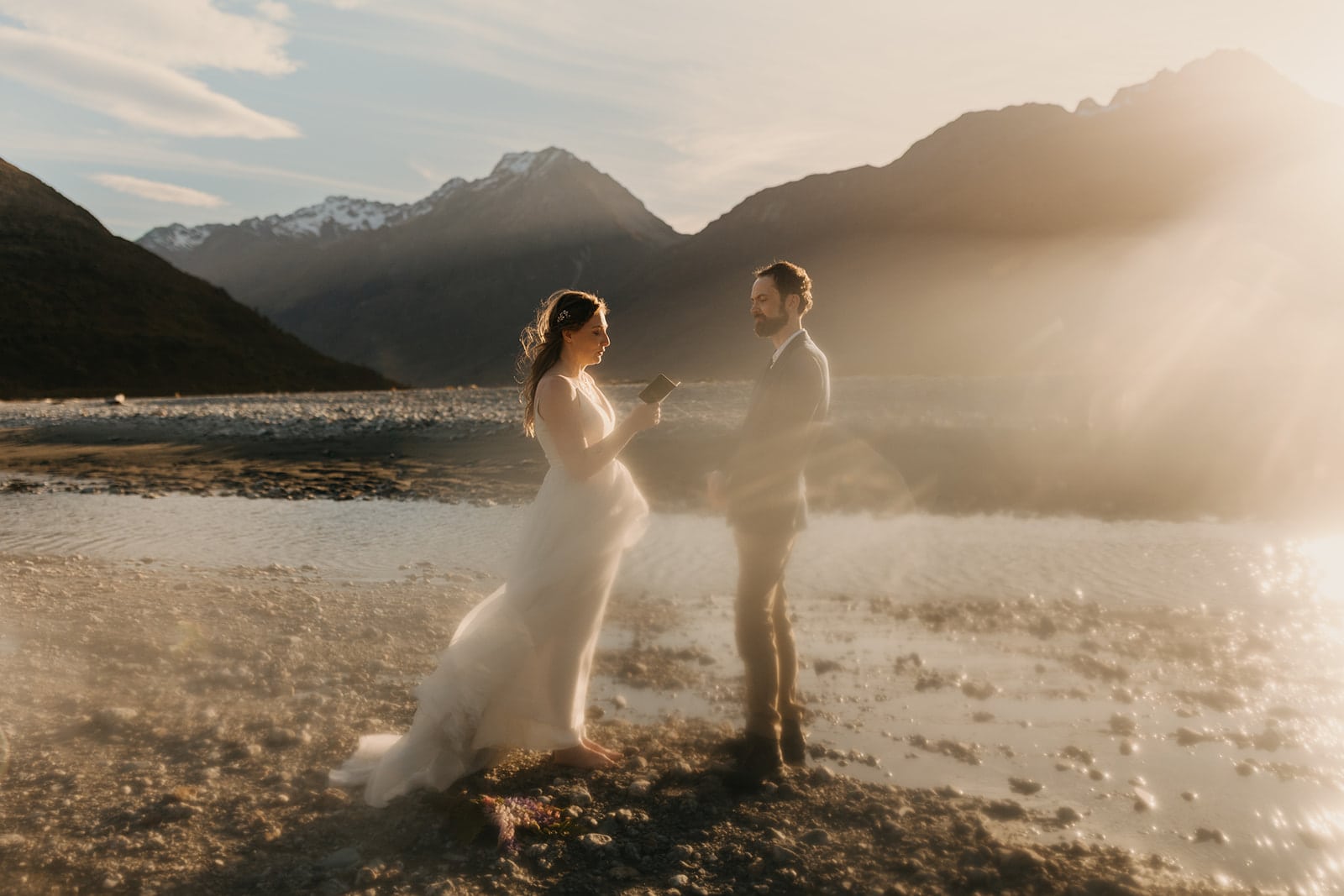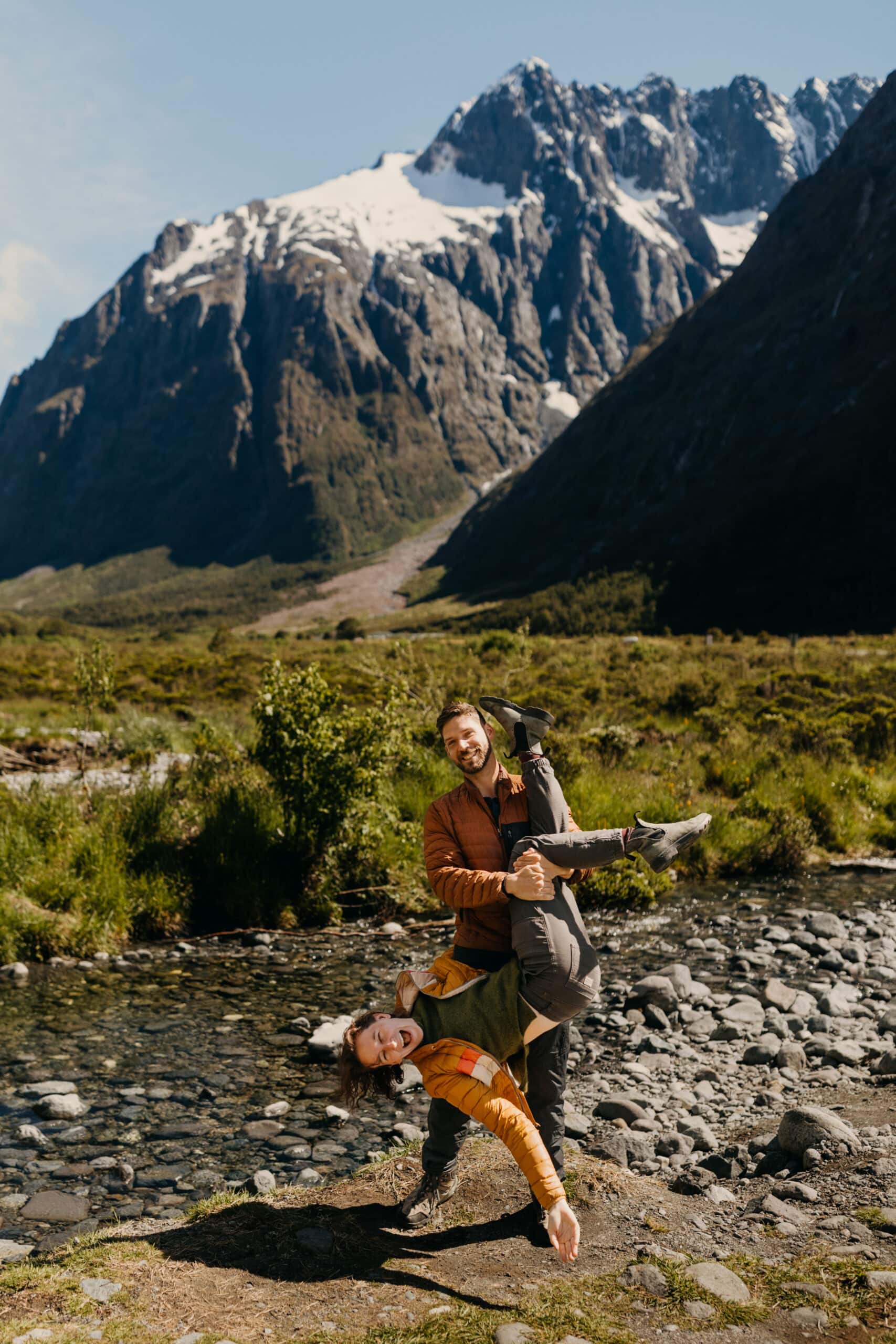 We arrive to the Dart River where they would share their first look among the lupines in the sunshine with you guessed it, another 360 mountain view – it is really a theme. After the first look we drove down a long dirt road even passing a herd of back lit horses running kicking up dust behind them in the direction we were headed. It was one of those by chance, wild movie like moments. We had entered another new National Park in New Zealand – Mount Aspiring. We arrived to the parking area, another….oh I won’t say it, that was simply incredible. No one else around. We gleefully made our way to the river as the sun was perfection. Once we crossed the streams to the perfect spot Aimee + Rob shared their vows with each other – new promises and honoring the past 10 years married together. They danced to their original first dance song and then a new song, Taylor Swift of course. It was a beautiful celebration of our friends love, being back in this place and all of us being together for all of these highs together.