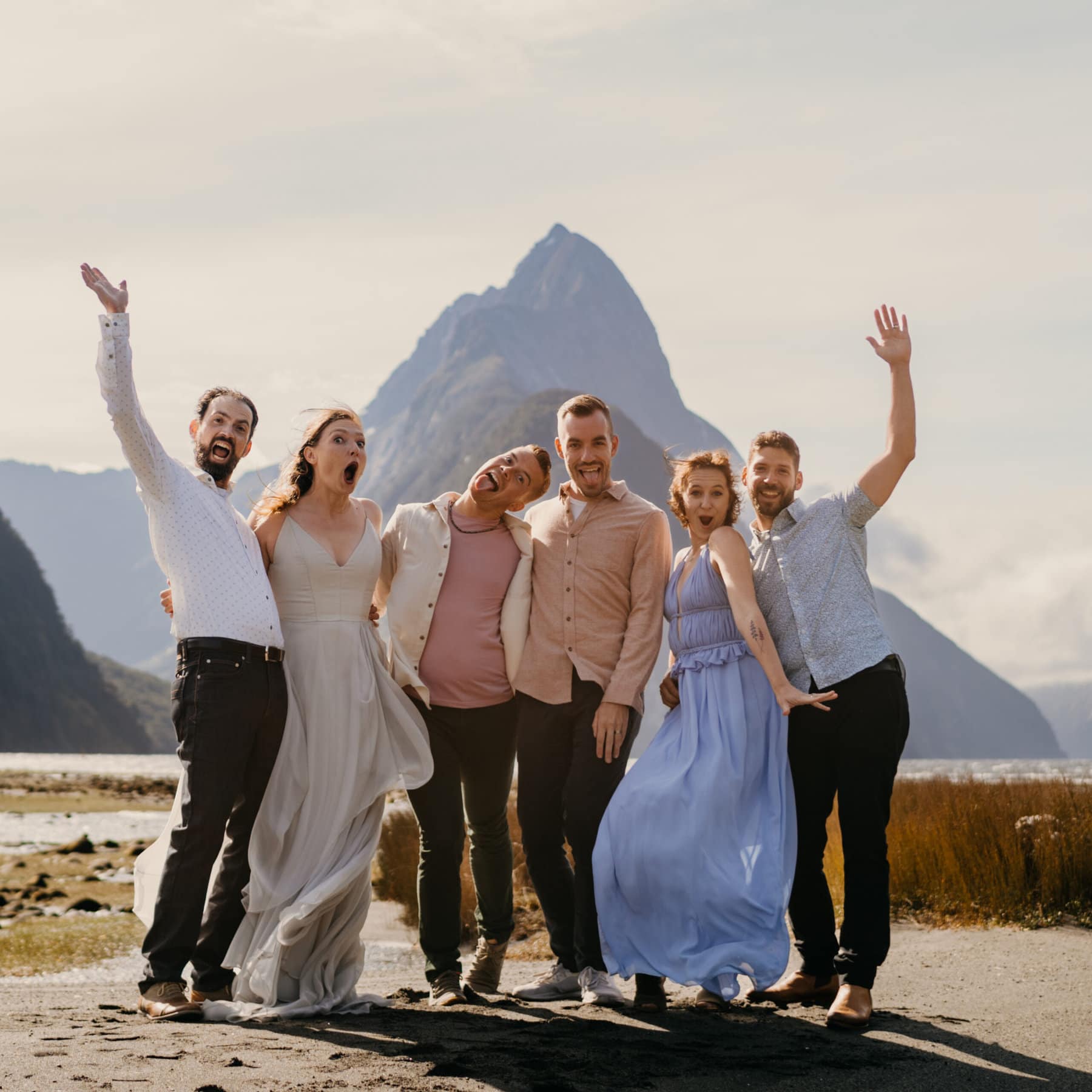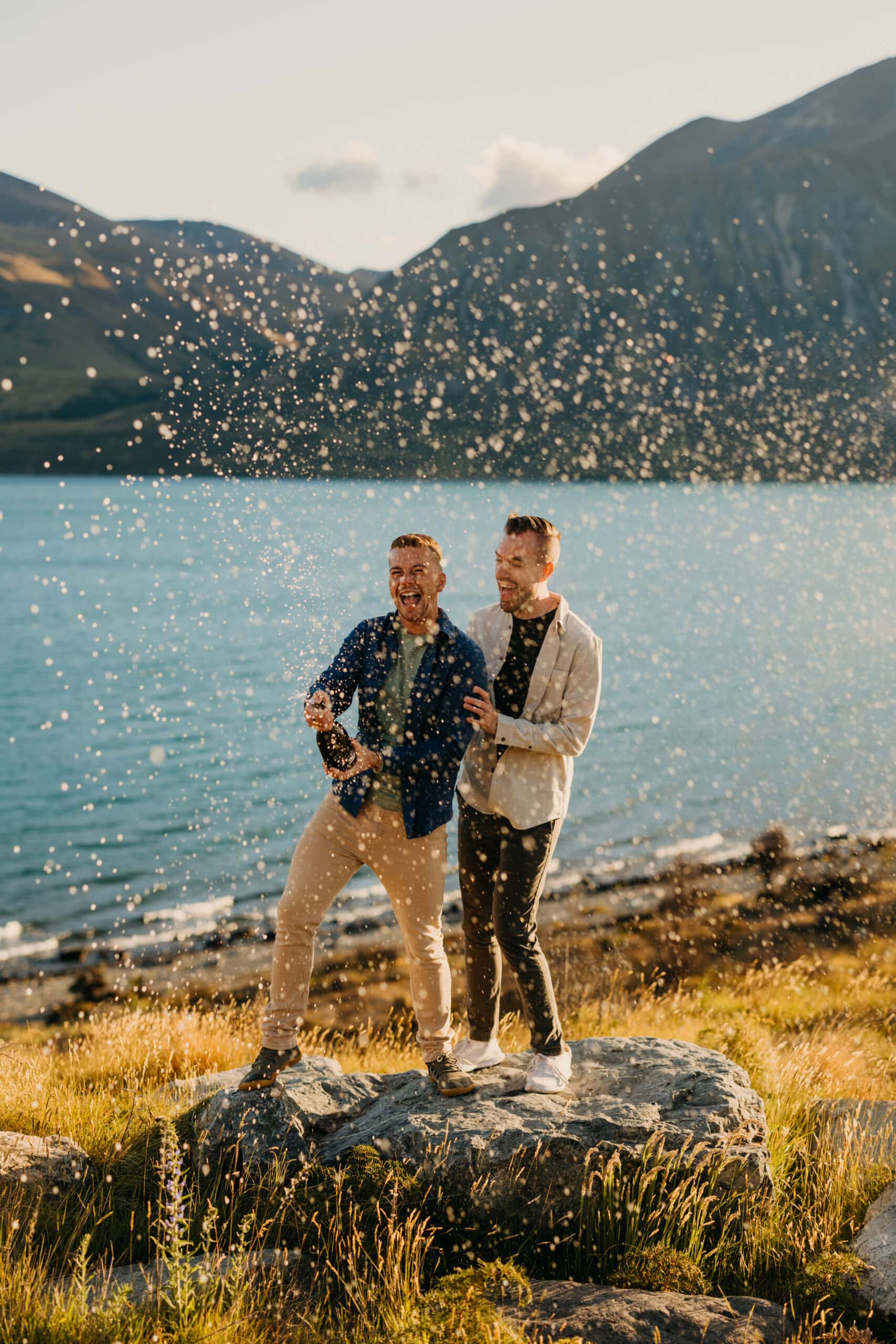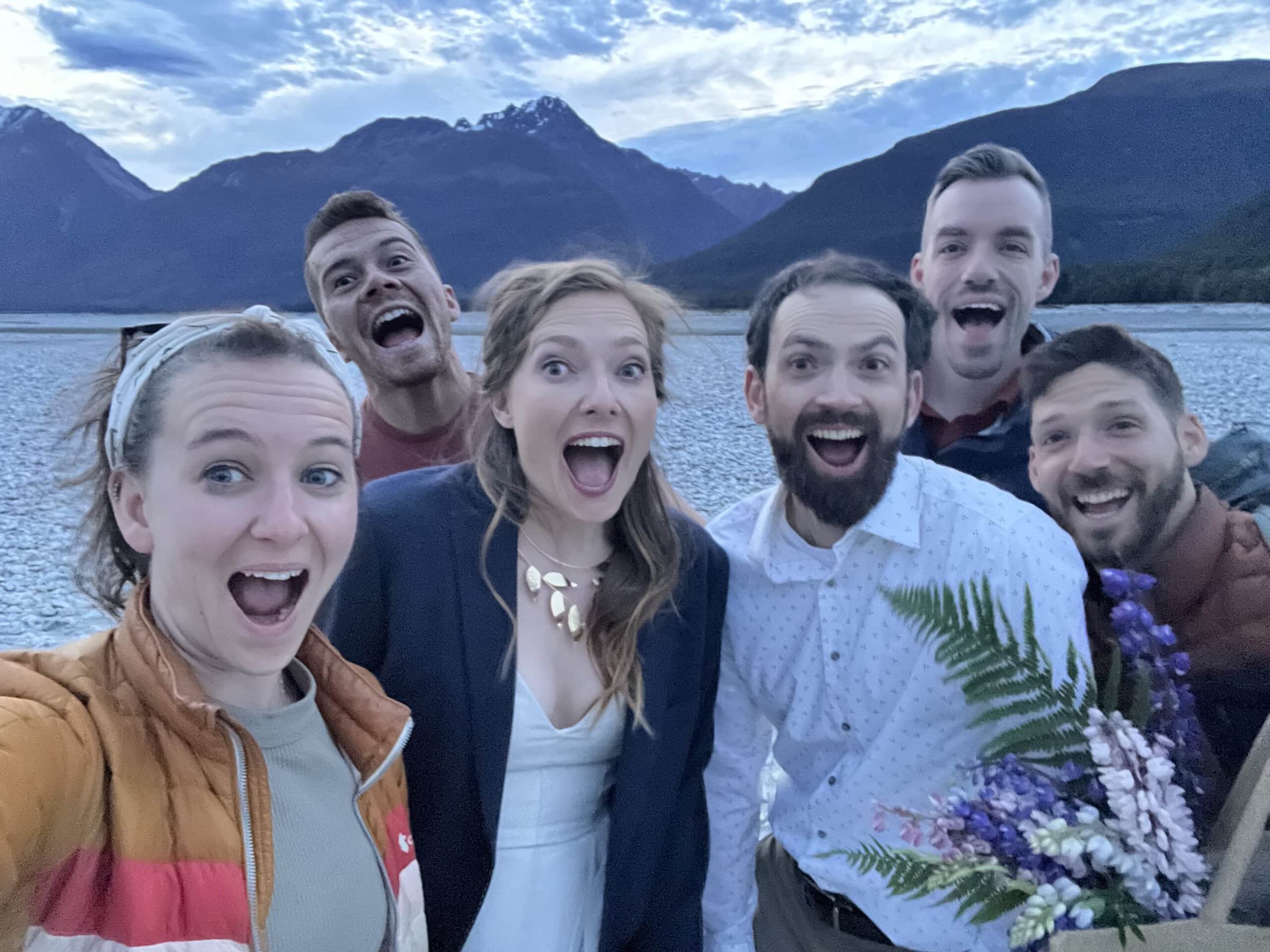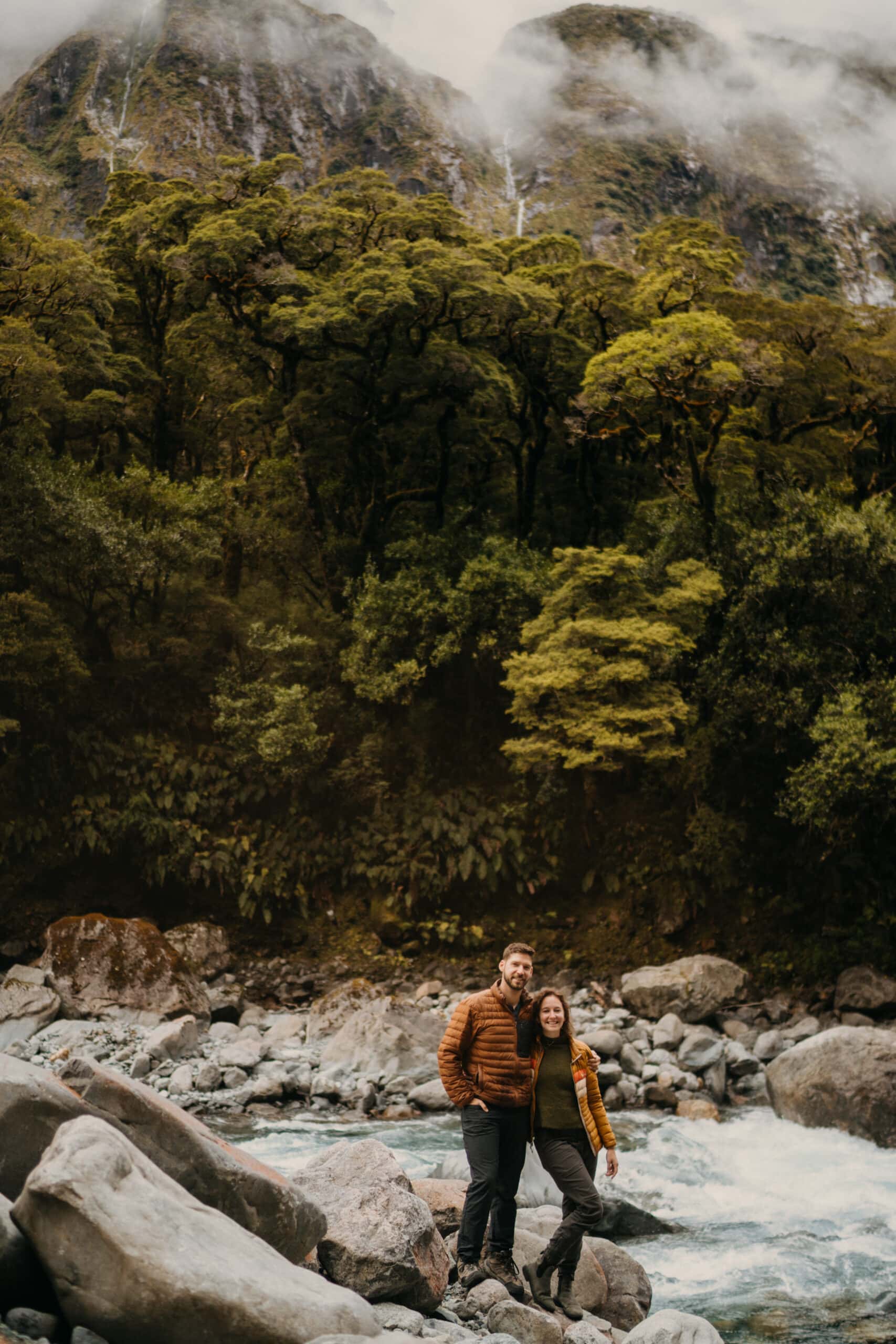 We arrive to the Dart River where they would share their first look among the lupines in the sunshine with you guessed it, another 360 mountain view – it is really a theme. After the first look we drove down a long dirt road even passing a herd of back lit horses running kicking up dust behind them in the direction we were headed. It was one of those by chance, wild movie like moments. We had entered another new National Park in New Zealand – Mount Aspiring. We arrived to the parking area, another….oh I won’t say it, that was simply incredible. No one else around. We gleefully made our way to the river as the sun was perfection. Once we crossed the streams to the perfect spot Aimee + Rob shared their vows with each other – new promises and honoring the past 10 years married together. They danced to their original first dance song and then a new song, Taylor Swift of course. It was a beautiful celebration of our friends love, being back in this place and all of us being together for all of these highs together.