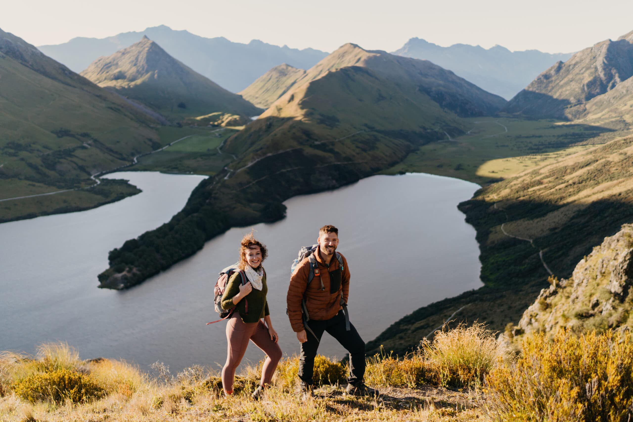 Another pre-sunrise early start for this day!!! Since we missed the big hike we wanted to do in Wanaka I found a short local’s spot near by trail that was screaming my name. It was only 1.2 miles and only 15 minutes from the house. We set out driving into the mountains saying good morning to the cows and sheep on the road. The trail was no joke. Another whopping 1300 ft of gain in less than a mile. We arrived at the top just in time for sunrise overlooking the lake with another 360 mountain views. We took portraits of our one friend that joined and Bill and I dressed up for some photos together. It felt like we were in a movie similar to The Sound of Music, it didn’t feel real, just beautiful. We hiked down and in many spots butt scooted back down enjoying the birds and ducks near the water. This easily became my second favorite hike on the trip, so much so, I would do it again.